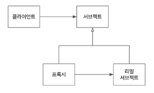 위 그림은 프록시 패턴의 구조이다. 서브젝트라는 인터페이스가 있고 프록시와 리얼 서브젝트 클래스가 서브젝트 인터페이스를 구현하고 있다. 그리고 프록시 클래스는 리얼 서브젝트 클래스를 참조한다.